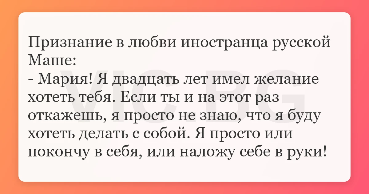 Признание в любви иностранца русской Маше: - Мария! Я двадцать лет имел желание хотеть тебя. Если ты и на этот раз откажешь, я просто не знаю, что я буду хотеть делать с собой. Я просто или покончу в себя, или наложу себе в руки!