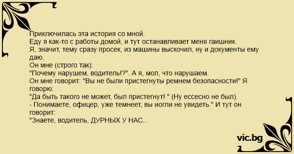 Он мне (строго так): "Почему нарушем, водитель!?". А я, мол, что нарушаем. Он мне говорит: "Вы не были пристегнуты ремнем безопасности!" Я говорю: "Да быть такого не может, был пристегнут! " (Ну ессесно не был). - Понимаете, офицер, уже темнеет, вы иогли не увидеть." И тут он говорит: "Знаете, водитель, ДУРНЫХ У НАС В МИЛИЦИЮ ИНОГДА БЕРУТ, НО СЛЕПЫХ НЕТ!!!" После этой фразы я одной рукой схватился за багажник, чтобы не упасть, другой отдал 5 гривен (около $2) схватил документы и быстренько уехал, а то умер бы на месте. P.S. Да, у этой истории есть продолжение, меня еще 4 раза останавливали в разных местах города и в других областях, в некоторых местах происходил примерно тот же разговор. Все 4 рассказали что они здоровы, двое что у них 100% зрение, но такого как в первый раз не было. Попробуте сами !