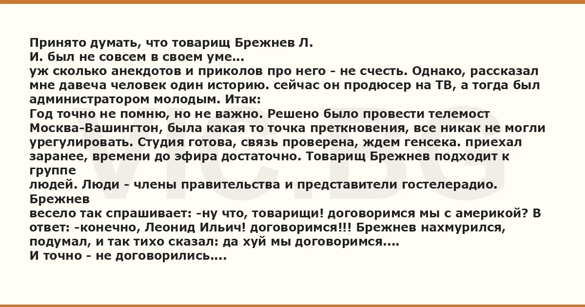 ответ: -конечно, Леонид Ильич! договоримся!!! Брежнев нахмурился,
