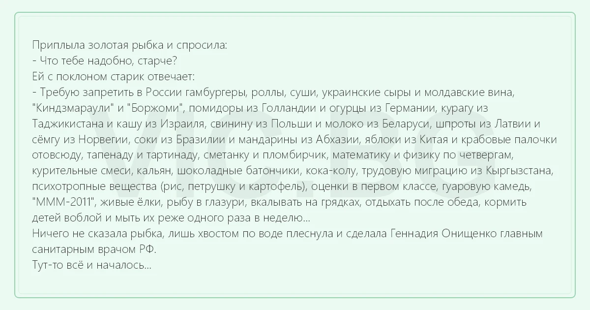- Требую запретить в России гамбургеры, роллы, суши, украинские сыры и молдавские вина, "Киндзмараули" и "Боржоми", помидоры из Голландии и огурцы из Германии, курагу из Таджикистана и кашу из Израиля, свинину из Польши и молоко из Беларуси, шпроты из Латвии и сёмгу из Норвегии, соки из Бразилии и мандарины из Абхазии, яблоки из Китая и крабовые палочки отовсюду, тапенаду и тартинаду, сметанку и пломбирчик, математику и физику по четвергам, курительные смеси, кальян, шоколадные батончики, кока-колу, трудовую миграцию из Кыргызстана, психотропные вещества (рис, петрушку и картофель), оценки в первом классе, гуаровую камедь, "МММ-2011", живые ёлки, рыбу в глазури, вкалывать на грядках, отдыхать после обеда, кормить детей воблой и мыть их реже одного раза в неделю...
