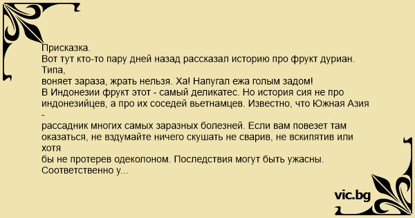 Вот тут кто-то пару дней назад рассказал историю про фрукт дуриан. Типа,