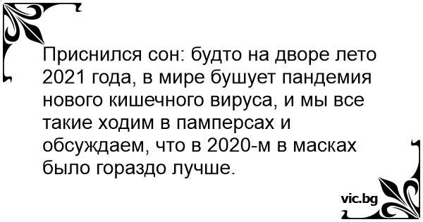 Приснился сон: будто на дворе лето 2021 года, в мире бушует пандемия нового кишечного вируса, и мы все такие ходим в памперсах и обсуждаем, что в 2020-м в масках было гораздо лучше.