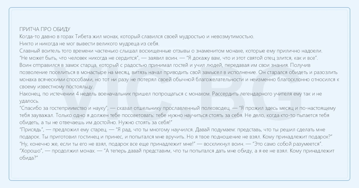 “Хорошо”, — продолжил монах. — “А теперь давай представим, что ты попытался дать мне обиду, а я ее не взял. Кому принадлежит обида?”