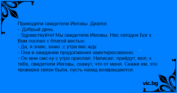 - Он мне смс-ку с утра прислал. Написал: прийдут, мол, к тебе, свидетели Иеговы, скажут, что от меня. Скажи им, это проверка связи была, пусть назад возвращаются.