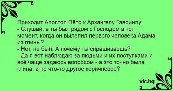 - Слушай, а ты был рядом с Господом в тот момент, когда он вылепил первого человека Адама из глины?