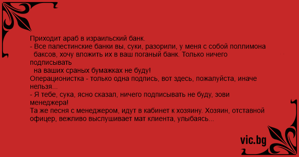 - Все палестинские банки вы, суки, разорили, у меня с собой поллимона
