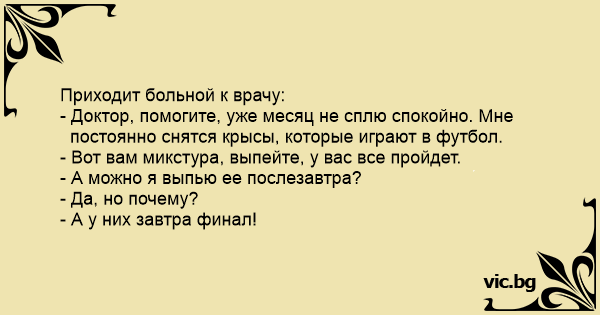 A man went to doctor, "Doctor every night in my dream I am playing soccer." Doctor say, "Take these pills, they will help you sleep better." The man, "I can't take them, tonight is the final game."