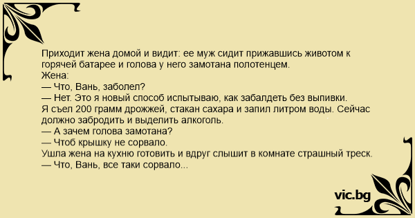 Приходит жена домой и видит: ее муж сидит прижавшись животом к горячей батарее и голова у него замотана полотенцем.