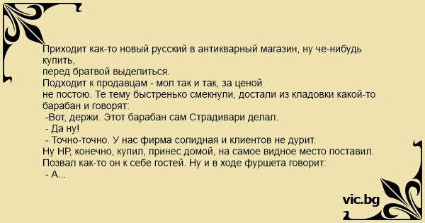 Приходит как-то новый русский в антикварный магазин, ну че-нибудь купить, перед братвой выделиться.