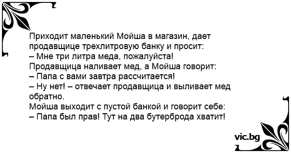 Малото еврејче влегува во продавницата и подава една празна тегла: Малко еврейче влиза в магазин и подава буркан: В магазин приходит маленький Мойша.
