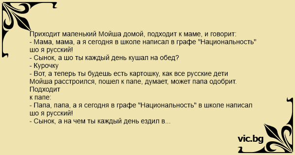 Приходит маленький Мойша домой, подходит к маме, и говорит: