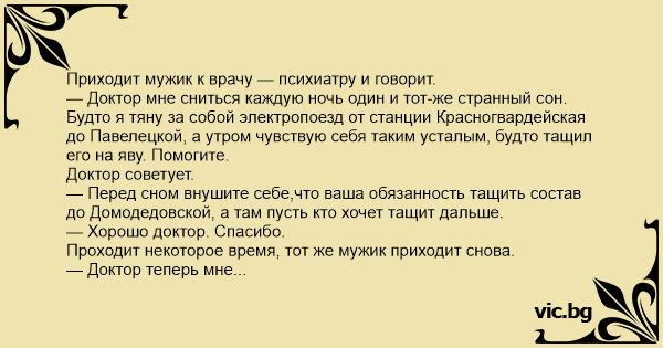 Приходит мужик к врачу — психиатру и говорит. — Доктор мне сниться каждую ночь один и тот-же странный сон. Будто я тяну за собой электропоезд от станции Красногвардейская до Павелецкой, а утром чувствую себя таким усталым, будто тащил его на яву. Помогите. Доктор советует. — Перед сном внушите себе,что ваша обязанность тащить состав до Домодедовской, а там пусть кто хочет тащит дальше. — Хорошо доктор. Спасибо. Проходит некоторое время, тот же мужик приходит снова. — Доктор теперь мне сниться другой сон. Будто я занимаюсь ceкcом с 10-ю девушками всю ночь, а утром как убитый. До работы еле доползаю. Помогите. — Внушите себе перед сном будто ваша обязанность тр@хнуть всего четырех девушек а дальше пусть кто хочет продолжает. — Доктор, а нельзя хотябы двух??? — Разве плохо четырех за ночь? Многие мечтают о таких снах... — Доктор мне же еще поезд от Красногвардейской до Домодедовской тянуть.