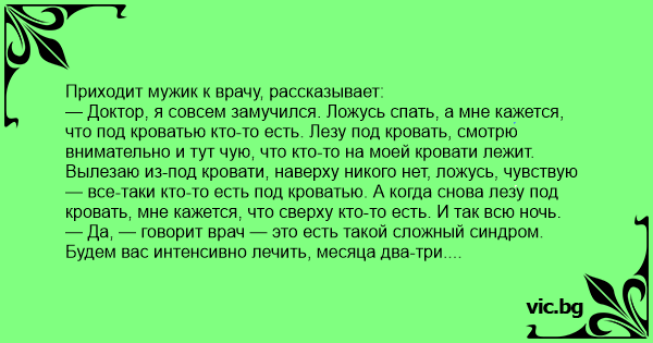 — Доктор, я совсем замучился. Ложусь спать, а мне кажется, что под кроватью кто-то есть. Лезу под кровать, смотрю внимательно и тут чую, что кто-то на моей кровати лежит. Вылезаю из-под кровати, наверху никого нет, ложусь, чувствую — все-таки кто-то есть под кроватью. А когда снова лезу под кровать, мне кажется, что сверху кто-то есть. И так всю ночь.