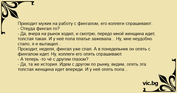 - Да, вчера на рынок ходил, и смотрю, передо мной женщина идет, толстая такая. И у неё попа платье зажевала... Ну, мне неудобно стало, я и вытащил...