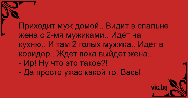Приходит муж домой.. Видит в спальне жена с 2-мя мужиками.. Идёт на кухню.. И там 2 голых мужика.. Идёт в коридор.. Ждет пока выйдет жена..