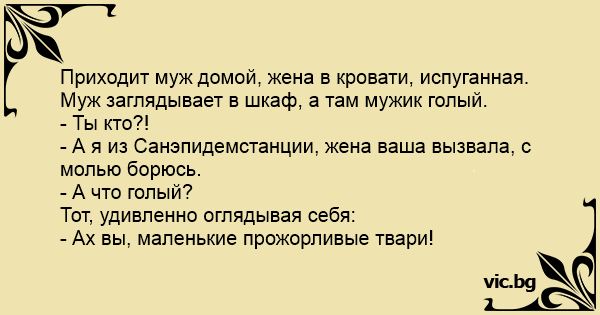 Приходить чоловік додому, заглядає у шафу, а там мужик голий. — !? — А я з Санепідемстанції, дружина ваша викликала, з міллю борюсь. — А чого голий? — (здивовано оглядаючи себе) Ах ви ж,...