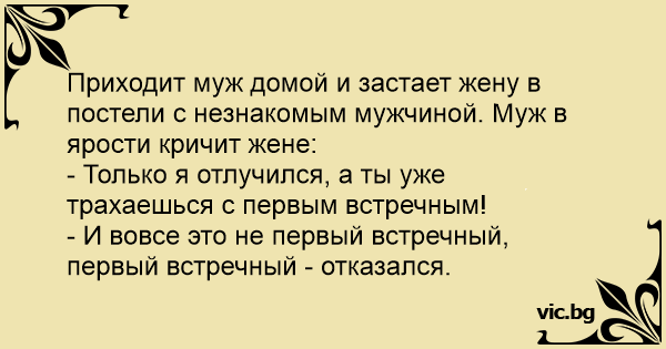 Приходит муж домой и застает жену в постели с незнакомым мужчиной. Муж в ярости кричит жене: