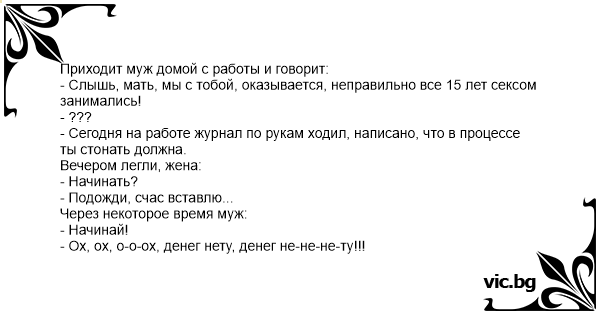 - Слышь, мать, мы с тобой, оказывается, неправильно все 15 лет сексом занимались!