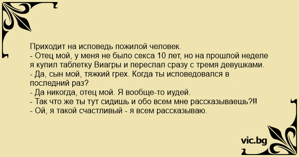- Отец мой, у меня не было cekca 10 лет, но на прошлой неделе я купил таблетку Виагры и переспал сразу с тремя девушками.