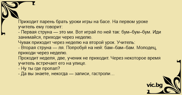 Приходит парень брать уроки игры на басе. На первом уроке учитель ему говорит: