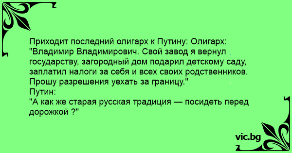"Владимир Владимирович. Свой завод я вернул государству, загородный дом подарил детскому саду, заплатил налоги за себя и всех своих родственников. Прошу разрешения уехать за границу."