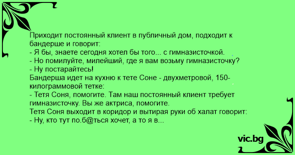 Приходит постоянный клиент в публичный дом, подходит к бандерше и говорит: - Я бы, знаете сегодня хотел бы того... с гимназисточкой. - Но помилуйте, милейший, где я вам возьму гимназисточку? - Ну постарайтесь! Бандерша идет на кухню к тете Соне - двухметровой, 150-килограммовой тетке: - Тетя Соня, помогите. Там наш постоянный клиент требует гимназисточку. Вы же актриса, помогите. Тетя Соня выходит в коридор и вытирая руки об халат говорит: - Ну, кто тут по.б@ться хочет, а то я в гимназию опаздываю.