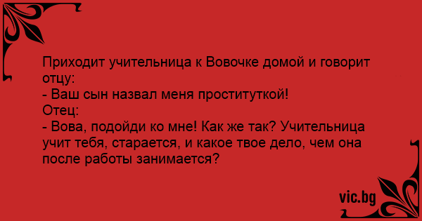 - Вова, подойди ко мне! Как же так? Учительница учит тебя, старается, и какое твое дело, чем она после работы занимается?