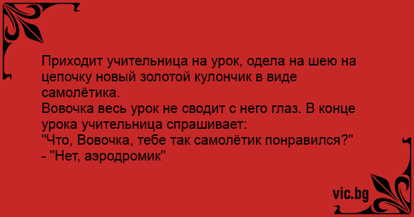Приходит учительница на урок, одела на шею на цепочку новый золотой кулончик в виде самолётика.