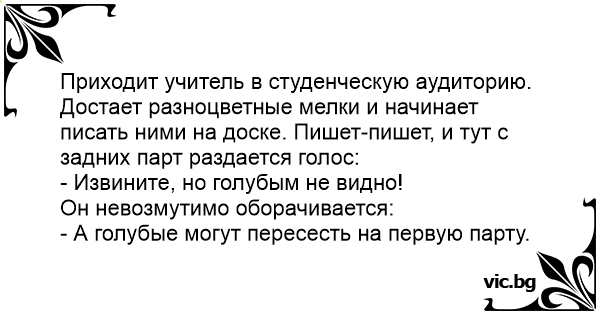 Приходит учитель в студенческую аудиторию. Достает разноцветные мелки и начинает писать ними на доске. Пишет-пишет, и тут с задних парт раздается голос: