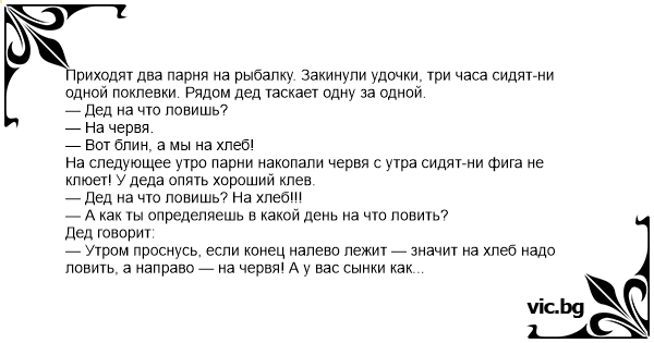 Приходят два парня на рыбалку. Закинули удочки, три часа сидят-ни одной поклевки. Рядом дед таскает одну за одной.