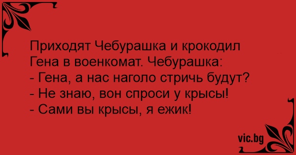 Приходят Чебурашка и крокодил Гена в военкомат. Чебурашка:
