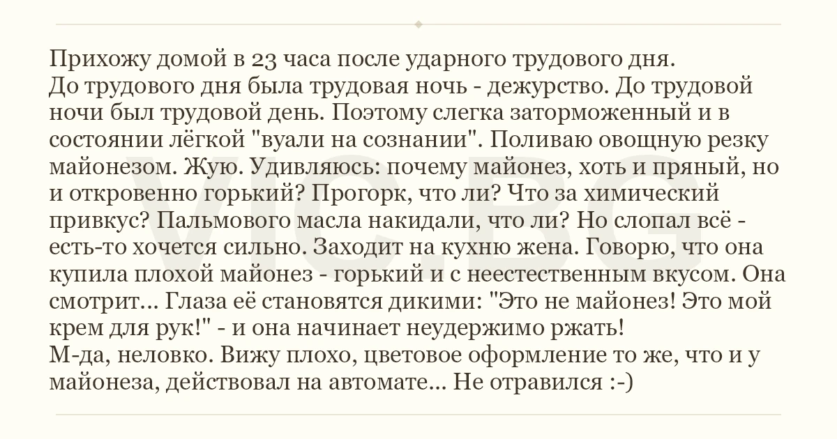 До трудового дня была трудовая ночь - дежурство. До трудовой ночи был трудовой день. Поэтому слегка заторможенный и в состоянии лёгкой "вуали на сознании". Поливаю овощную резку майонезом. Жую. Удивляюсь: почему майонез, хоть и пряный, но и откровенно горький? Прогорк, что ли? Что за химический привкус? Пальмового масла накидали, что ли? Но слопал всё - есть-то хочется сильно. Заходит на кухню жена. Говорю, что она купила плохой майонез - горький и с неестественным вкусом. Она смотрит... Глаза её становятся дикими: "Это не майонез! Это мой крем для рук!" - и она начинает неудержимо ржать!