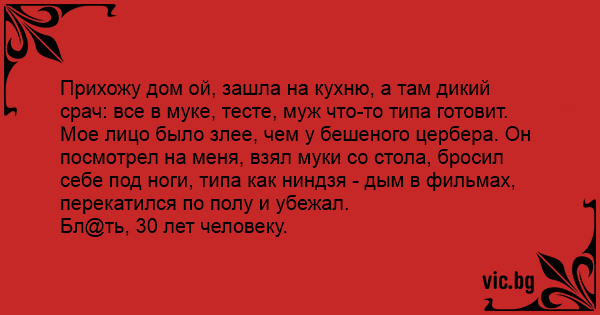 Прихожу дом ой, зашла на кухню, а там дикий срач: все в муке, тесте, муж что-то типа готовит. Мое лицо было злее, чем у бешеного цербера. Он посмотрел на меня, взял муки со стола, бросил себе под ноги, типа как ниндзя - дым в фильмах, перекатился по полу и убежал. Бл@ть, 30 лет человеку.