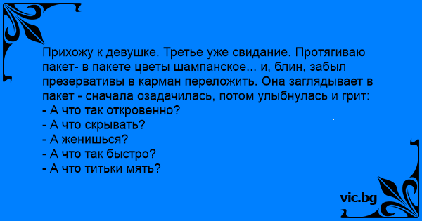 Прихожу к девушке. Третье уже свидание. Протягиваю пакет- в пакете цветы шампанское... и, блин, забыл презервативы в карман переложить. Она заглядывает в пакет - сначала озадачилась, потом улыбнулась и грит: