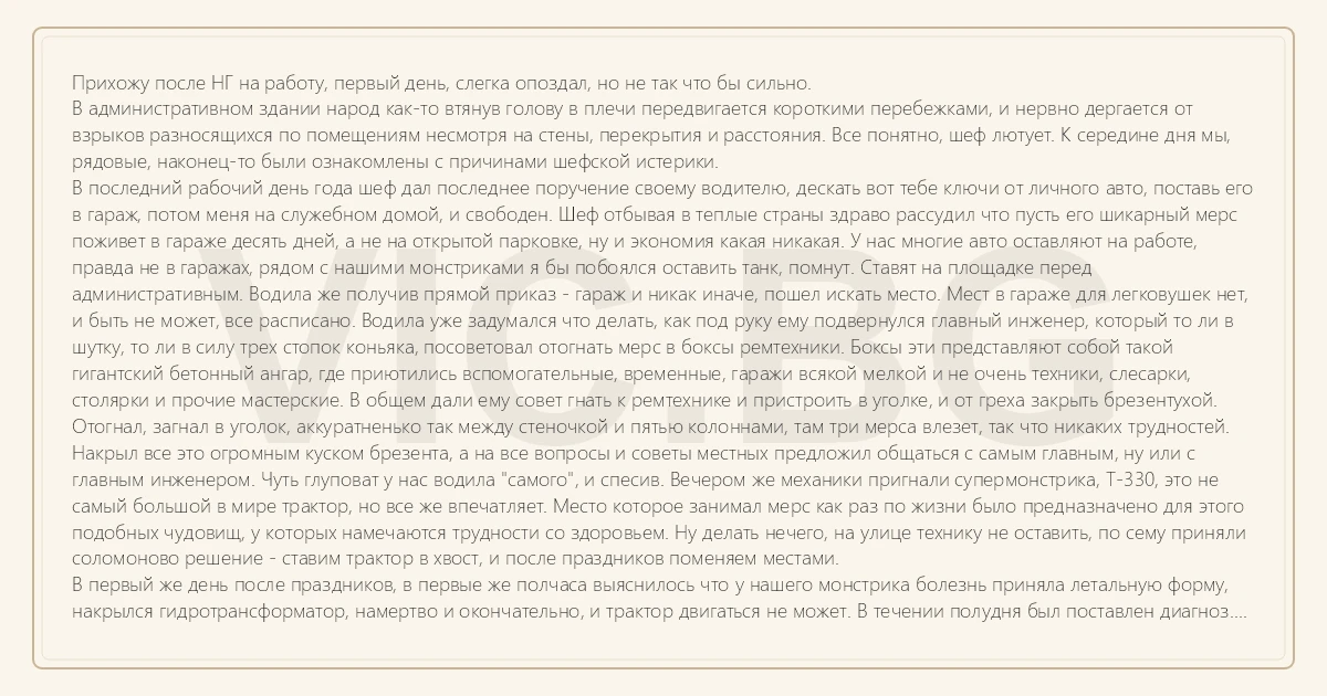 Прихожу после НГ на работу, первый день, слегка опоздал, но не так что бы сильно. В административном здании народ как-то втянув голову в плечи передвигается короткими перебежками, и нервно дергается от взрыков разносящихся по помещениям несмотря на стены, перекрытия и расстояния. Все понятно, шеф лютует. К середине дня мы, рядовые, наконец-то были ознакомлены с причинами шефской истерики. В последний рабочий день года шеф дал последнее поручение своему водителю, дескать вот тебе ключи от личного авто, поставь его в гараж, потом меня на служебном домой, и свободен. Шеф отбывая в теплые страны здраво рассудил что пусть его шикарный мерс поживет в гараже десять дней, а не на открытой парковке, ну и экономия какая никакая. У нас многие авто оставляют на работе, правда не в гаражах, рядом с нашими монстриками я бы побоялся оставить танк, помнут. Ставят на площадке перед административным. Водила же получив прямой приказ - гараж и никак иначе, пошел искать место. Мест в гараже для легковушек нет, и быть не может, все расписано. Водила уже задумался что делать, как под руку ему подвернулся главный инженер, который то ли в шутку, то ли в силу трех стопок коньяка, посоветовал отогнать мерс в боксы ремтехники. Боксы эти представляют собой такой гигантский бетонный ангар, где приютились вспомогательные, временные, гаражи всякой мелкой и не очень техники, слесарки, столярки и прочие мастерские. В общем дали ему совет гнать к ремтехнике и пристроить в уголке, и от греха закрыть брезентухой. Отогнал, загнал в уголок, аккуратненько так между стеночкой и пятью колоннами, там три мерса влезет, так что никаких трудностей. Накрыл все это огромным куском брезента, а на все вопросы и советы местных предложил общаться с самым главным, ну или с главным инженером. Чуть глуповат у нас водила "самого", и спесив. Вечером же механики пригнали супермонстрика, Т-330, это не самый большой в мире трактор, но все же впечатляет. Место которое занимал мерс как раз по жизни было предназначено для этого подобных чудовищ, у которых намечаются трудности со здоровьем. Ну делать нечего, на улице технику не оставить, по сему приняли соломоново решение - ставим трактор в хвост, и после праздников поменяем местами. В первый же день после праздников, в первые же полчаса выяснилось что у нашего монстрика болезнь приняла летальную форму, накрылся гидротрансформатор, намертво и окончательно, и трактор двигаться не может. В течении полудня был поставлен диагноз. Во-первых трактор не сдвинуть, ну куда ты сорок тонн будешь поперек хода двигать, тем более нечем, ни одна из окрестных железяк его даже на сантиметр не сдвинет. Во-вторых ремонт при наличии запчастей как минимум на пару суток, но запчастей нет, надо заказывать, а это очень долго (покупка даже болта шестерки нынче чуть ли не президентом утверждается :-( ). В РФ январь как бы не очень рабочий месяц, вся наша контора считала дни до даты поставки запчастей, ибо шеф был "слегка" не в духе. Две недели назад машину шефа вытащили из заточения. Контора в тот день устроила грандиозный корпоратив, естественно без ведома шефа и после его отъезда с территории.