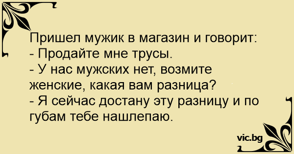 Во продавница за долна облека влегнува купувач и ја прашува продавачката: - Имате ли мъжки боксерки? В магазин за бельо влиза купувач и пита продавачката: Во продавница за долна облека. Цветко ја прашува продавачката: