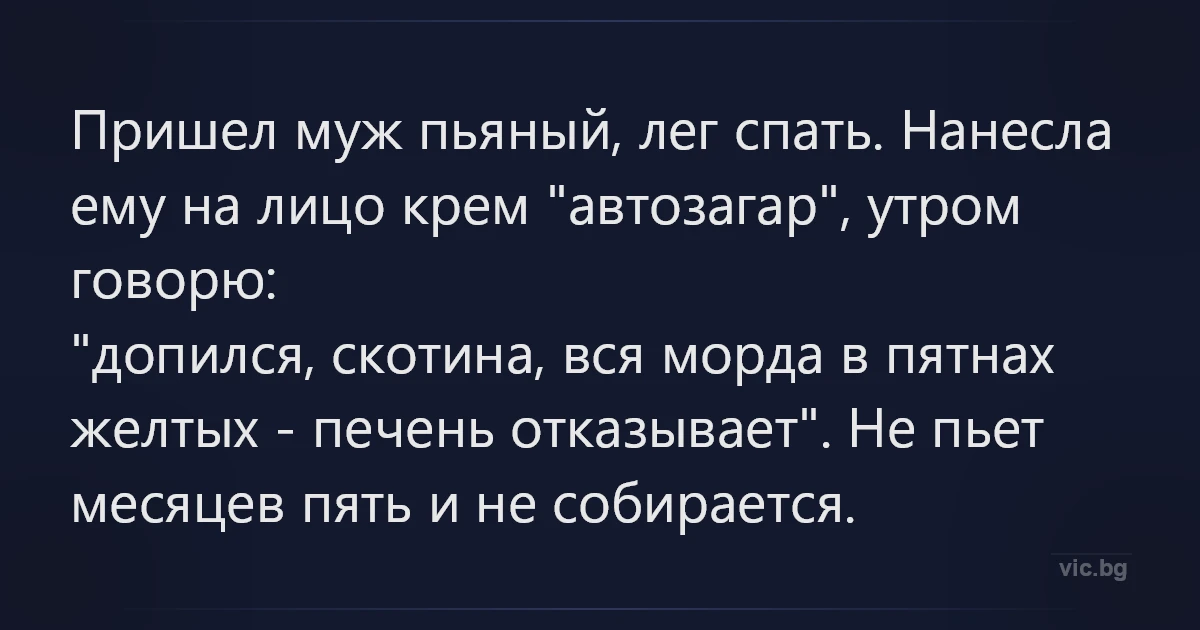Пришел муж пьяный, лег спать. Нанесла ему на лицо крем "автозагар", утром говорю:<br />"допился, скотина, вся морда в пятнах желтых - печень отказывает". Не пьет месяцев пять и не собирается.