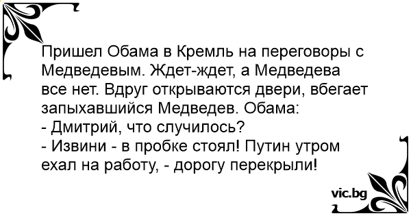 Пришел Обама в Кремль на переговоры с Медведевым. Ждет-ждет, а Медведева все нет. Вдруг открываются двери, вбегает запыхавшийся Медведев. Обама: