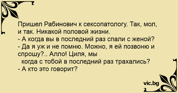 Пришел Рабинович к сексопатологу. Так, мол, и так. Никакой половой жизни.