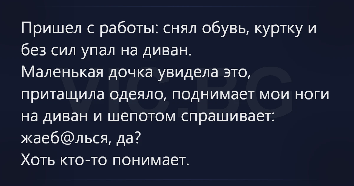 Пришел с работы: снял обувь, куртку и без сил упал на диван. Маленькая дочка увидела это, притащила одеяло, поднимает мои ноги на диван и шепотом спрашивает: жаеб@лься, да? Хоть кто-то понимает.