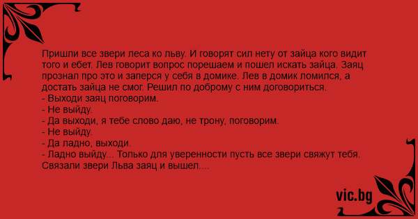 Пришли все звери леса ко льву. И говорят сил нету от зайца кого видит того и ебет. Лев говорит вопрос порешаем и пошел искать зайца. Заяц прознал про это и заперся у себя в домике. Лев в домик ломился, а достать зайца не смог. Решил по доброму с ним договориться.