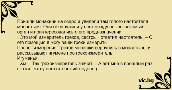 Пришли монахини на озеро и увидели там голого настоятеля монастыря. Они обнаружили у него между ног незнакомый орган и поинтересовались о его предназначении: