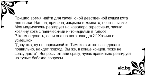 Пришло время найти для своей юной девственной кошки кота для вязки. Нашла, привела, закрыла в комнате, подглядываю. Моя мадмуазель реагирует на кавалера агрессивно, звоню хозяину кота с паническими интонациями в голосе: "Что мне делать, если она на него нападет?!" Хозяин с усмешкой: "Девушка, ну не переживайте. Тимоха в итоге все сделает правильно, найдет подход. Вы же, в конце концов, тоже не сразу даете". Вопросы отпали сразу, чувак правильно реагирует на тупые бабские вопросы