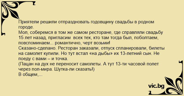 Дело в том, что на годовщину приглашены те, кто был на свадьбе 15 лет назад, а ЕГО ТАМ ТОГДА НЕ БЫЛО...