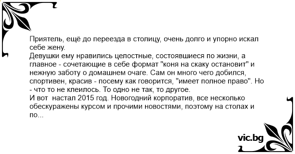И вот настал 2015 год. Новогодний корпоратив, все несколько обескуражены курсом и прочими новостями, поэтому на столах и по программе все очень скромно, а заведение выбрано в удаленном и несколько неблагополучном районе. Но шеф в виде исключения пошел на уступки, и разрешил пригласить помимо мужей - жен по 1 другу - знакомому, для расширения компании, так сказать. Коллега приятеля намекнула накануне, что пригласит одну свою очень интересную подругу, девушку неординарную и " уверена, что тебе понравится".