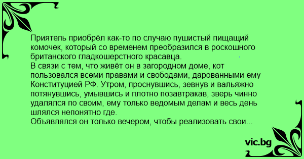 Объявлялся он только вечером, чтобы реализовать свои права на пожрать, полежать на хозяйском диване и великодушно позволить почесать себе за ухом. В один прекрасный день приятель задумал всё-таки выследить домашнего любимца, дабы быть в курсе того, как оный проводит свой рабочий день, пользуясь правом на свободу передвижений. И вот что, в конце концов, выяснилось: этот потомок подданных Её Величества отправлялся к соседям, где у него была своя миска, свой лоток и домик с матрасом. Его там кормили, расчёсывали, играли с ним и, более того, у него там была своя кличка, на которую он, по настроению, даже иногда откликался. Но самое интересное заключалось в том, что эти милые люди планировали в ближайшие выходные отвезти котика к ветеринару на кастрацию, чтобы он не шлялся чёрт знает где по ночам.