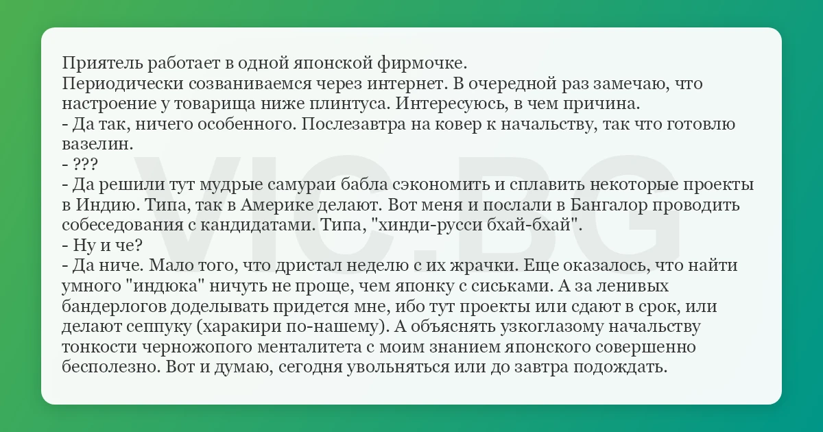 Приятель работает в одной японской фирмочке. Периодически созваниваемся через интернет. В очередной раз замечаю, что настроение у товарища ниже плинтуса. Интересуюсь, в чем причина. - Да так, ничего особенного. Послезавтра на ковер к начальству, так что готовлю вазелин. - ??? - Да решили тут мудрые самураи бабла сэкономить и сплавить некоторые проекты в Индию. Типа, так в Америке делают. Вот меня и послали в Бангалор проводить собеседования с кандидатами. Типа, "хинди-русси бхай-бхай". - Ну и че? - Да ниче. Мало того, что дристал неделю с их жрачки. Еще оказалось, что найти умного "индюка" ничуть не проще, чем японку с сиськами. А за ленивых бандерлогов доделывать придется мне, ибо тут проекты или сдают в срок, или делают сеппуку (харакири по-нашему). А объяснять узкоглазому начальству тонкости черножопого менталитета с моим знанием японского совершенно бесполезно. Вот и думаю, сегодня увольняться или до завтра подождать.