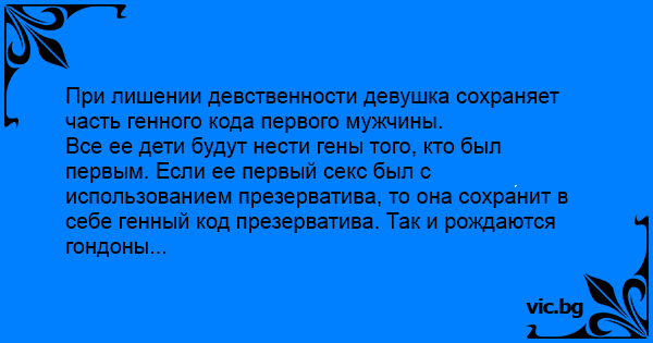 Все ее дети будут нести гены того, кто был первым. Если ее первый cekc был с использованием презерватива, то она сохранит в себе генный код презерватива. Так и рождаются гондоны...