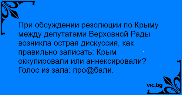 При обсуждении резолюции по Крыму между депутатами Верховной Рады возникла острая дискуссия, как правильно записать: Крым оккупировали или аннексировали? Голос из зала: про@бали.