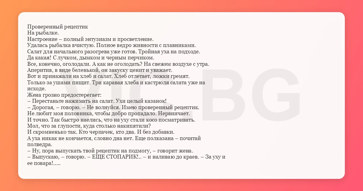– Выпускаю, – говорю. – ЕЩЕ СТОПАРИК!.. – и наливаю до краев. – За уху и
